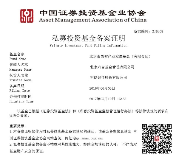 2016年:北京市果树产业发展基金(有限合伙)私募投资基金备案证明