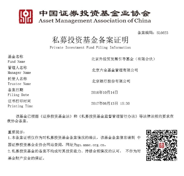 2016年:北京外经贸发展引导基金(有限合伙)私募投资基金备案证明